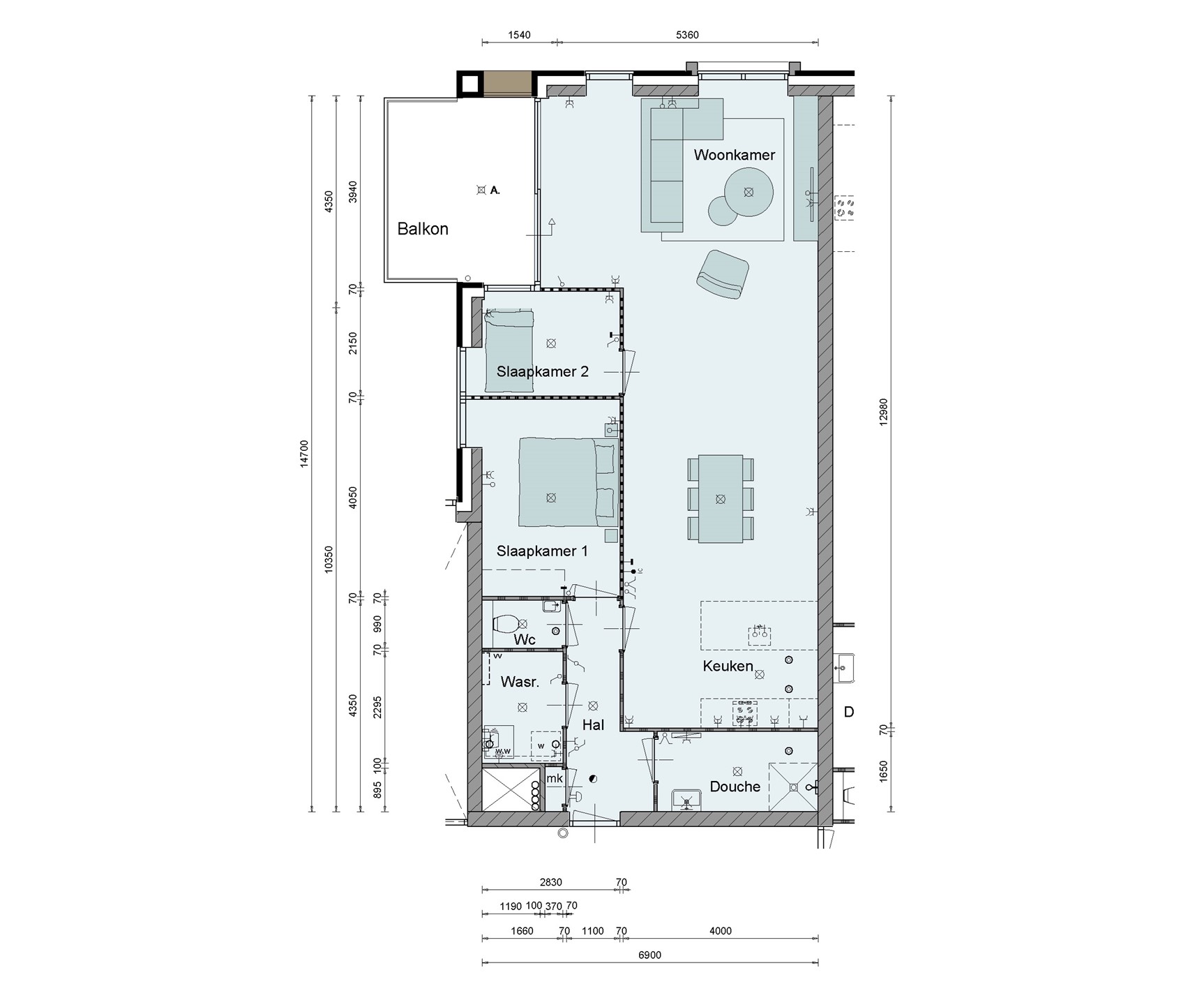 Van type D zijn drie appartementen beschikbaar. Ze liggen op de begane grond en op de eerste en tweede verdieping. De appartementen zijn noordoost-gericht, met ook een raampartij op het oosten. Het appartement op de begane grond beschikt over een terras en die op de verdiepingen over een (deels inpandig) balkon. De woonkamer biedt plaats aan en ruime zit- en eethoek. De open keuken is deels kamergericht, met een baropstelling. Het appartement heeft twee slaapkamers. De badkamer is voorzien van douche en wastafel. In de hal is een separaat toilet. In de technische ruimte/wasruimte bevinden zich aansluitingen voor een witgoedopstelling.