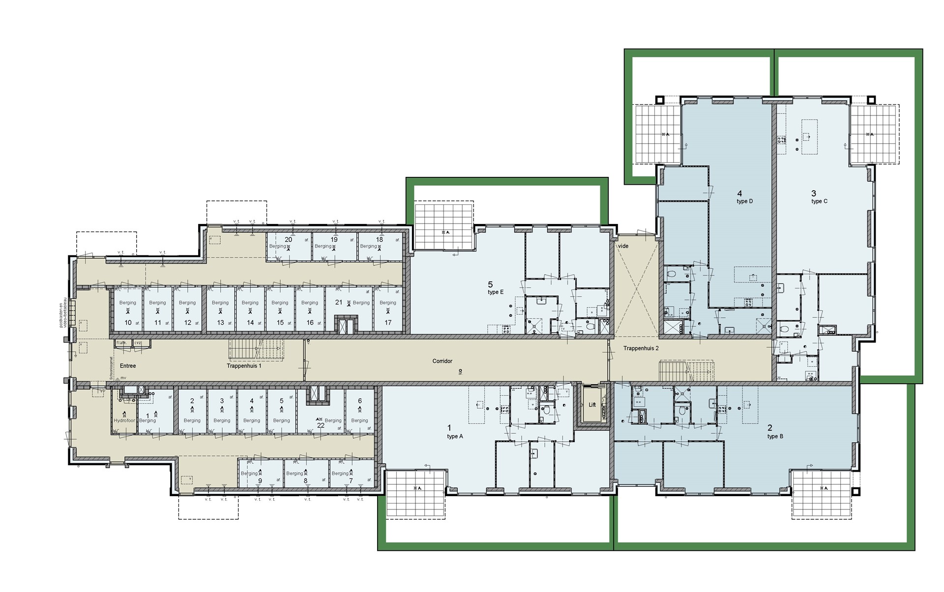 De entree van het complex geeft toegang tot een lange corridor. Direct bij de entree bevinden zich de postkasten en het bellentableau met video en intercominstallatie. In uw appartement kunt u op een schermpje zien wie er beneden heeft aangebeld. Een veilig gevoel! Ook bevinden zich hier de lift, twee trappenhuizen en de toegang tot de bergingen.