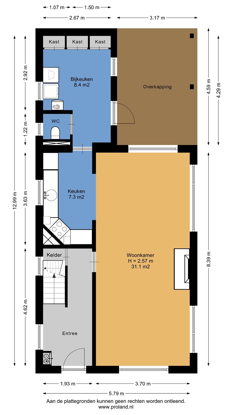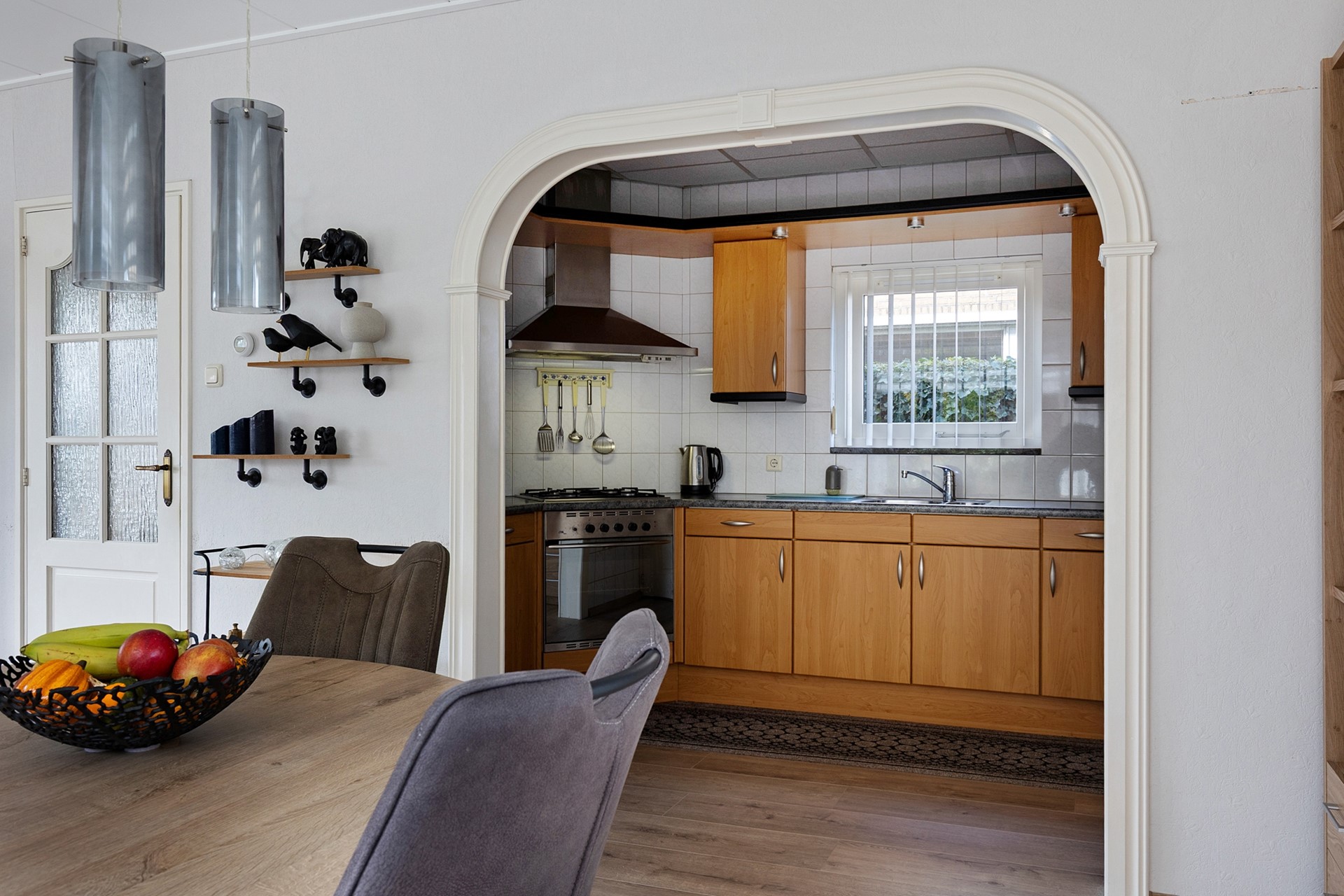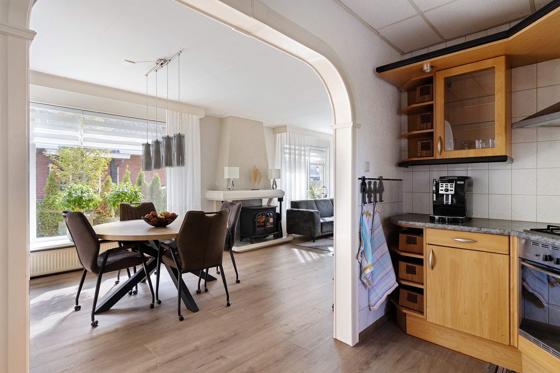 Entree, lichte woonkamer met plek voor een gezellige zithoek en eethoek, keuken met toegang tot de bijkeuken en het toilet.