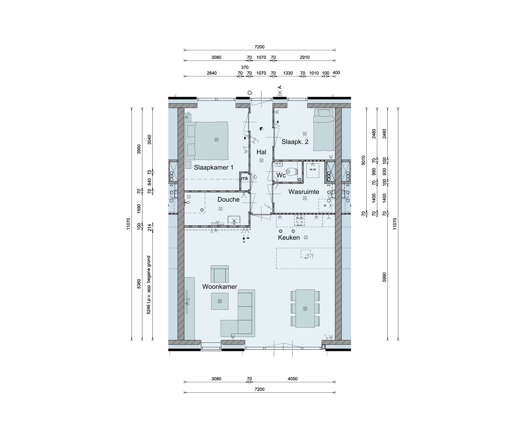 - De appartementen worden standaard opgeleverd zonder keuken en inclusief sanitair en tegelwerk (toilet en fonteintje, badkamer met toilet, wastafel en douchemengkraan met toebehoren);